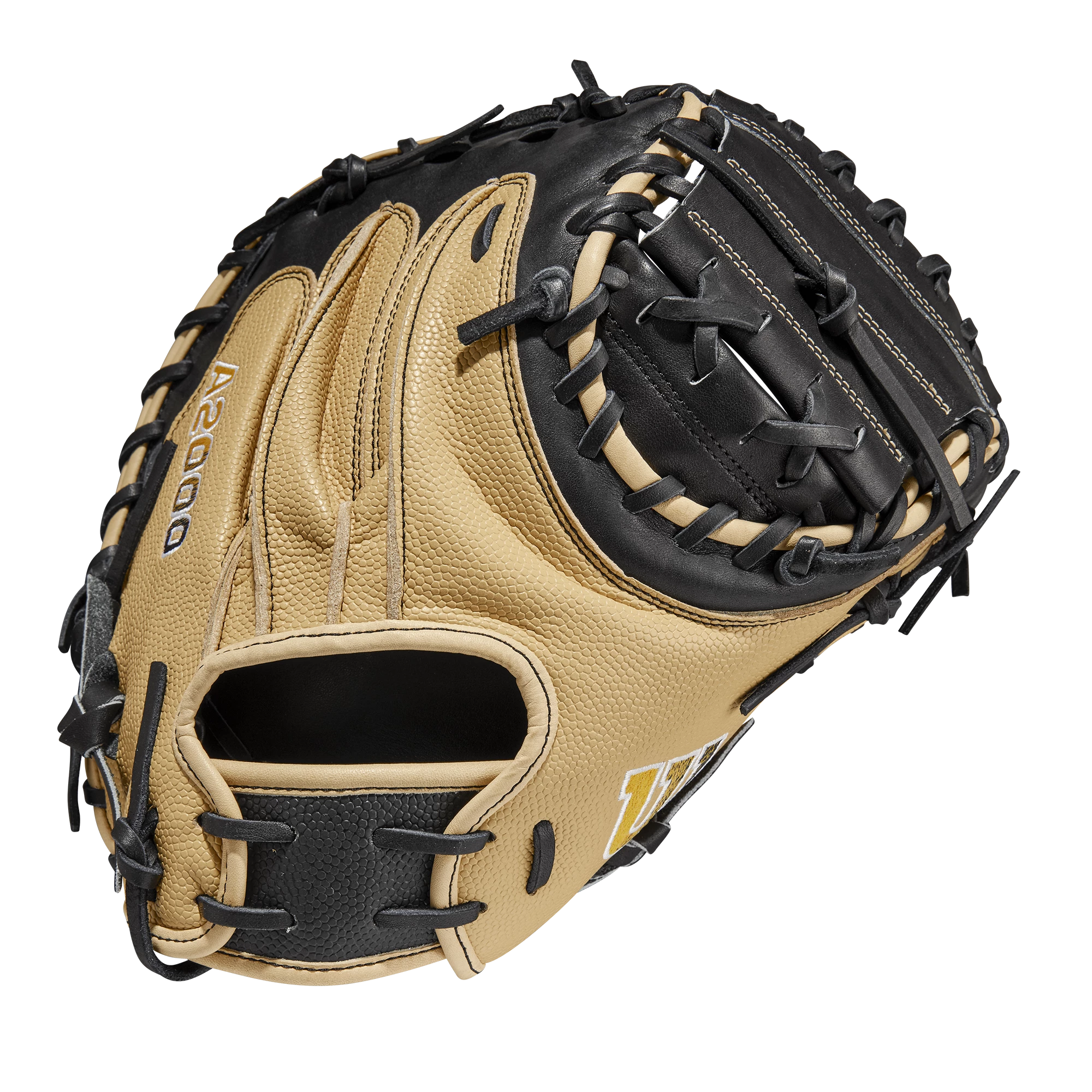 Ideal for advanced catchers looking to further their receiving and blocking technique, the A2000® 1790SS baseball catcher’s mitt pairs its Black Pro Stock® leather palm with Blonde SuperSkin™ to maximize feel and control behind the dish. The SuperSkin back on this 34” mitt reduces overall weight and repels moisture, and gradient Bold Logos enhance the modern look. Designed with an extended palm, wide Half Moon web and stiff thumb, this larger catcher’s mitt helps to reduce rebound when blocking balls in the dirt.