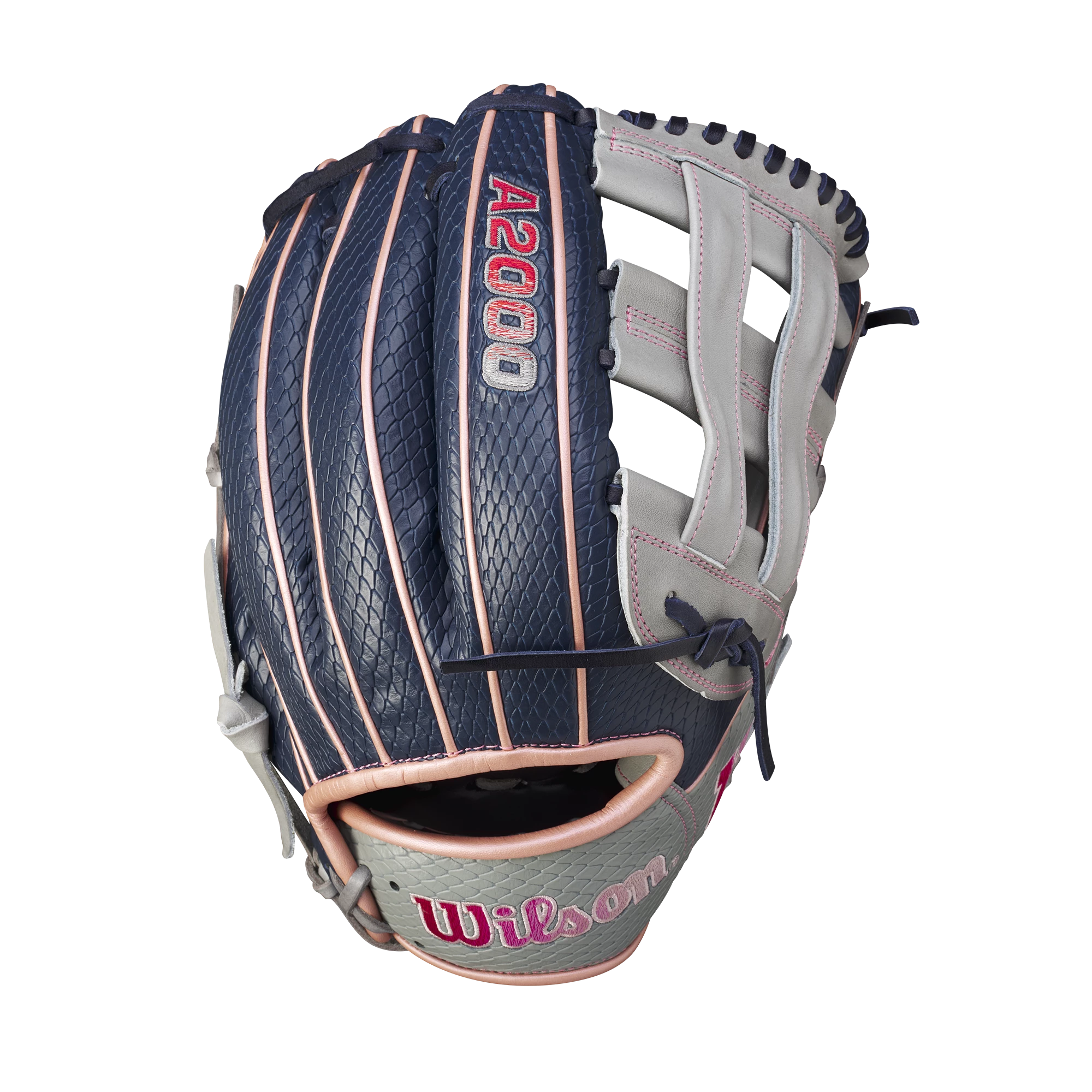 Dazzle at the hot corner like Jose Ramirez. Engineered for Cleveland’s star third baseman, the A2000® JR11 GM 12” Infield Glove offers all the tools needed to own the infield. The Grey Pro Stock® leather palm with a Dual Post Web is tailored to secure scorching line drives down the third base line, and the metallic Rose Gold stitching, Binding and Dual Welting reimagine what it means to flash the leather. Navy Blue SuperSnakeSkin™ sheds weight while repelling moisture from rain or wet grass, and Bold Logos shift from Red to Rose Gold for extra flash on the infield dirt.