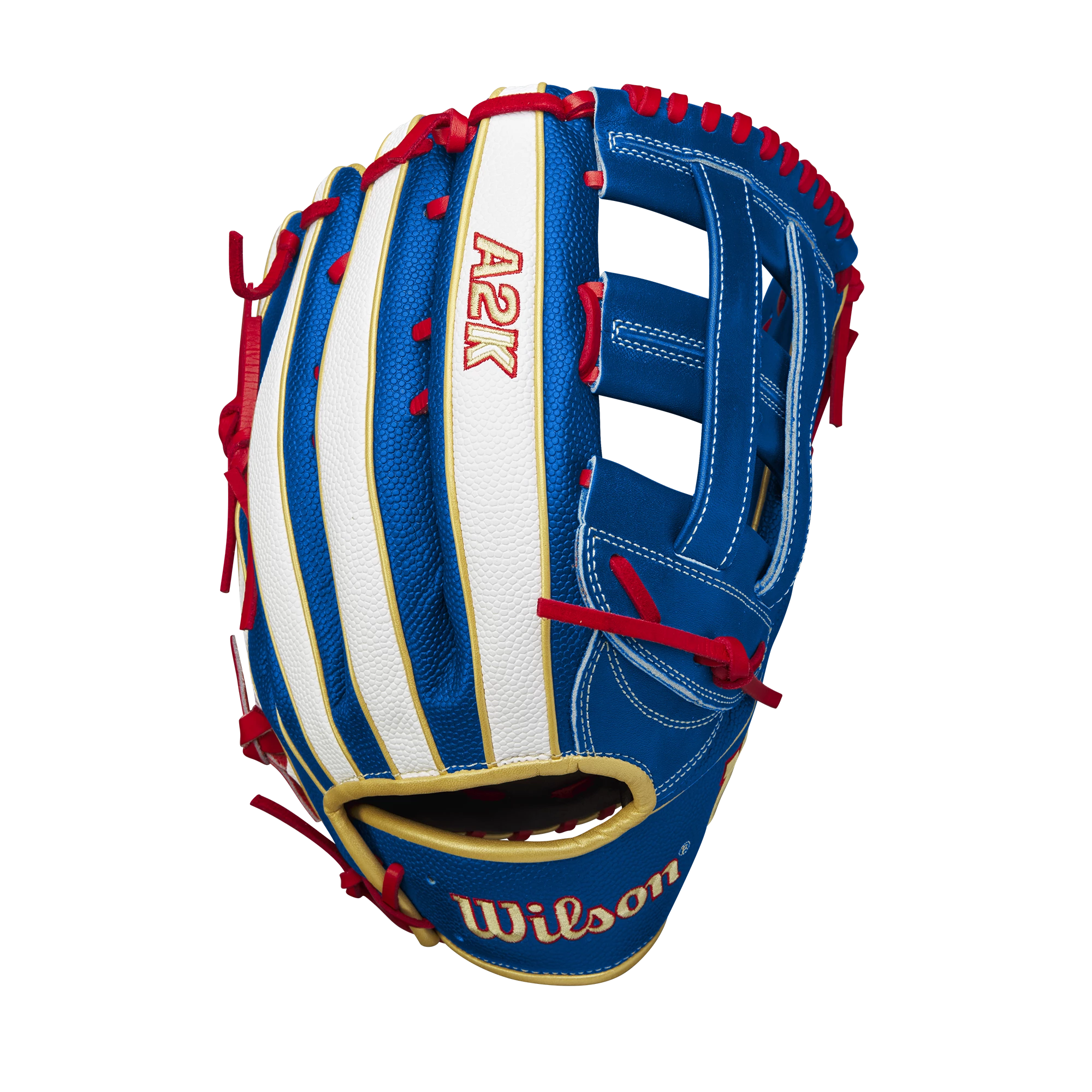Command the big stage with Mookie Betts’ signature glove, the 2023 A2K® MB50 GM. Mookie’s 12.5” design is engineered with lightweight Royal Blue and White SuperSkin™, a moisture-resistant material that sheds glove weight and improves control when tracking fly balls in the gap and robbing home runs at the wall. Mookie’s signature is imprinted in the Royal Blue Pro Stock® Select leather palm, and Double Palm Construction forms to your hand during the break-in process for unmatched feel and fit. Command this 12.5” glove to corral any ball hit your way and flash the subtle gold binding to bring luster to the outfield.