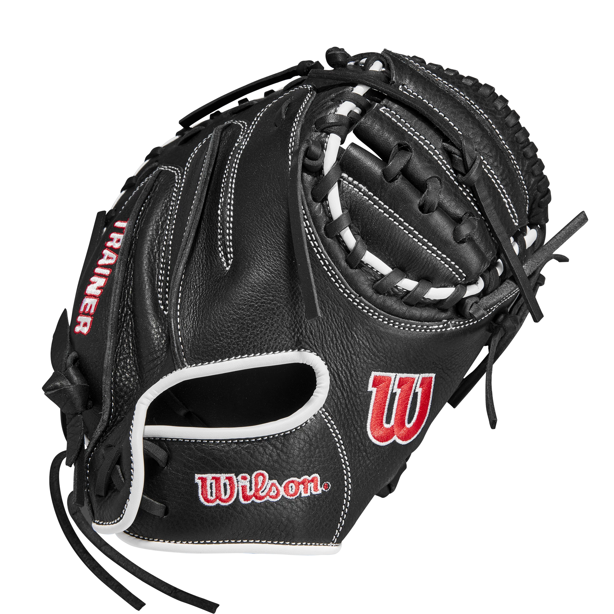 Learn to frame pitches on the edge of the strike zone or block balls in the dirt with the Wilson® 30” Catching Trainer, the training mitt engineered to help catchers improve all facets of their game behind the plate. This miniature training checks in at 30”, a smaller size that helps players to refine their receiving, framing and blocking skills behind the plate. Black Full Grain Leather construction offers a soft feel without unnecessary bulk, and a drawstring wrist closure allows for easy adjustments.